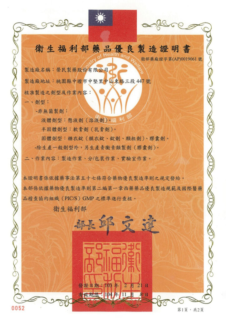 榮民製藥股份有限公司於2014年1月通過「PIC/S GMP」評鑑,