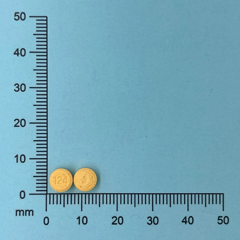 藥品外觀:橙黃色圓型平面錠,一面有「124」字樣,另一面有榮民製藥廠的標記。