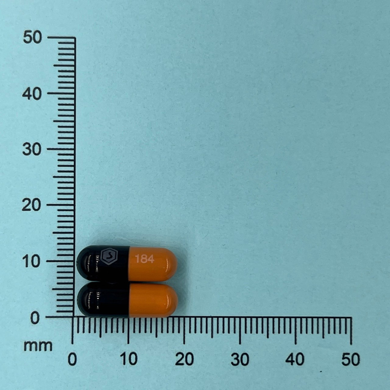 • 藥品外觀:黃色的粉末填充在NO.2 膠囊中,膠囊顏色一邊棕黃色一邊黑色,棕黃色部位有「184」標記,黑色部位有榮民製藥廠的標記。